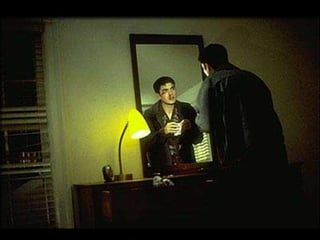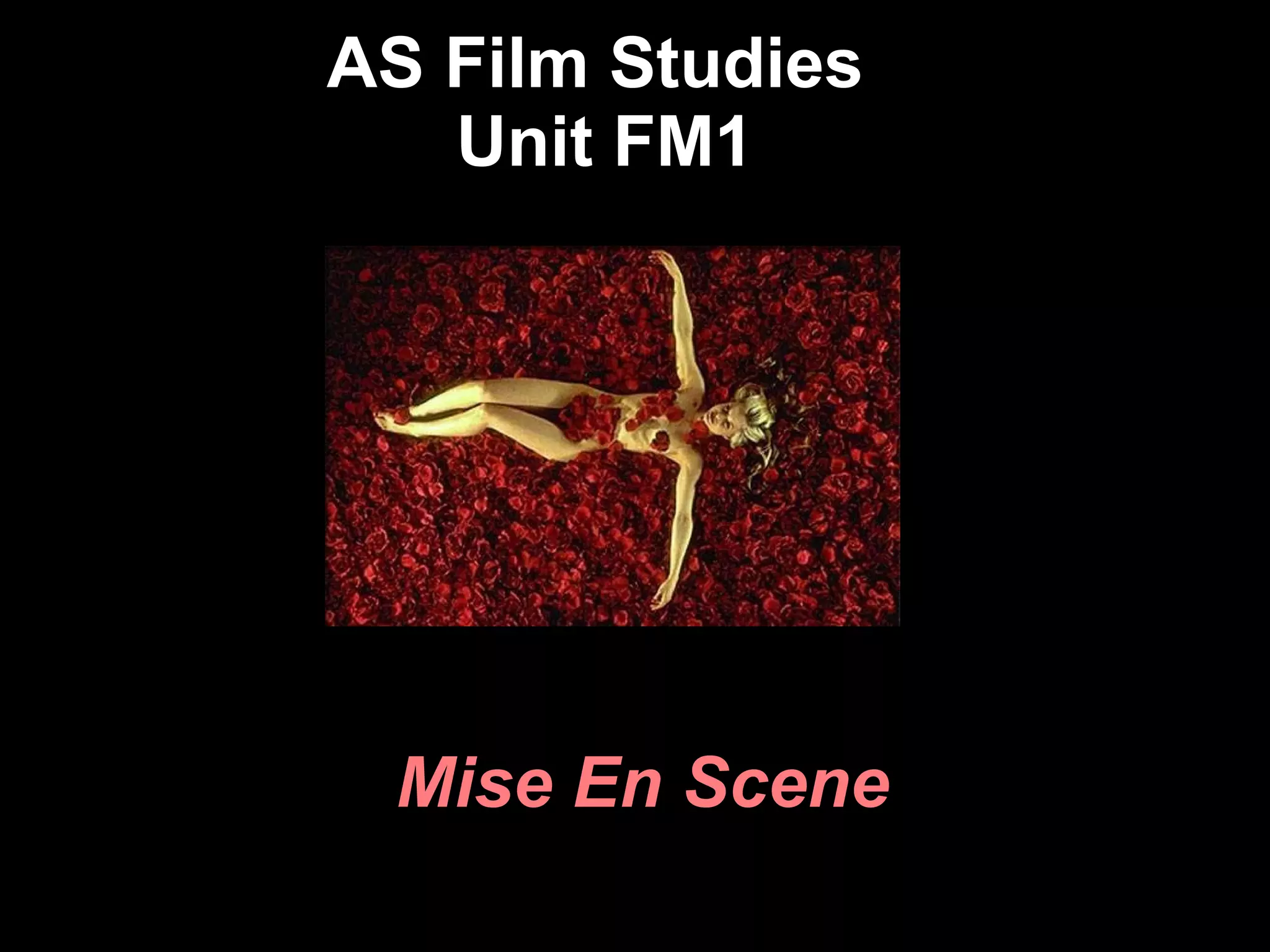 This document discusses the concept of mise-en-scene in filmmaking, which refers to everything that appears in front of the camera. It identifies the six elements of mise-en-scene as settings and props, costumes, facial expressions, lighting and color, sound, and character positioning. Each of these elements conveys hidden meanings and influences how the audience feels in a scene. The document provides examples of different types of lighting and their effects, and asks the reader to analyze the mise-en-scene in several images.