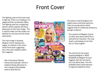 This document analyzes the mise-en-scene elements of various pages from a pop magazine featuring Meghan Trainor on the cover. It discusses the bright, high-key lighting used throughout to clearly show facial expressions. It also examines the colorful and youthful design aimed at younger audiences. Additionally, it looks at how articles are laid out with bold headings and questions to guide readers. Analyzing these magazines helped inform how the author will feature various images on the cover, use clear layouts and formatting, and incorporate lighting, costumes and colors to represent characters for their own magazine.