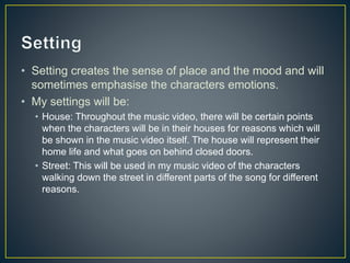 The document discusses setting, lighting, costume, makeup, hair, and props for a music video. It describes using the characters' houses and streets as settings to represent their home and public lives. Natural and artificial lighting will be used to convey the time of day and illuminate the story. Casual costumes and minimal, natural makeup and hair will represent the characters' everyday personalities and feelings. General household props may be included if linked to the song lyrics.