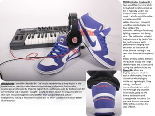 The document provides details about props used in a photoshoot for an indie music magazine. Headphones, a keyboard, and clothing were used to convey the musical theme. The headphones and keyboard in particular represent tools used by professionals in music creation and performance. Clothing choices also aimed to fit the casual yet stylish aesthetics often featured in indie magazines. Props like a watch and wristband further revealed aspects of the artist's personality and lifestyle.