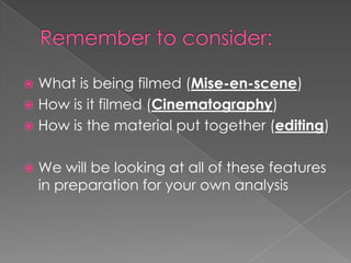 This document discusses various aspects of mise-en-scene and how they create meaning for audiences. It examines costume and props, setting, lighting, figure/expression/movement, and how each element conveys information about characters, genre, and mood. Students are instructed to analyze clips and consider questions like how costumes reflect character, what settings symbolize, and how lighting establishes atmosphere. The goal is to understand how intentional manipulation of elements within the frame can shape audience interpretation.