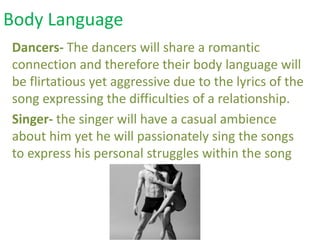 The document outlines the plans for a music video shoot. It discusses using flirtatious yet aggressive body language between the dancers to portray the difficulties in a relationship expressed in the song's lyrics. It also notes using a steady cam, natural lighting, and simple costumes to reinforce the romance and simplicity of a relationship while preventing the singer from looking awkward without props.