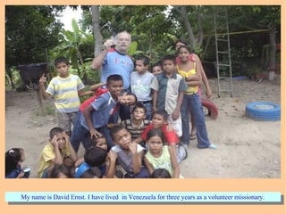 This document introduces David Ernst, a missionary living in Venezuela with his wife Luz Maria. They operate a Lutheran preschool called "Rays of Light" on the property of their home in La Caramuca. The document details the construction of a new building for the preschool, made possible by donations from churches in the United States. It describes the opening celebration for the new preschool facility and Luz Maria's vision to establish a Lutheran church and school to serve the community.