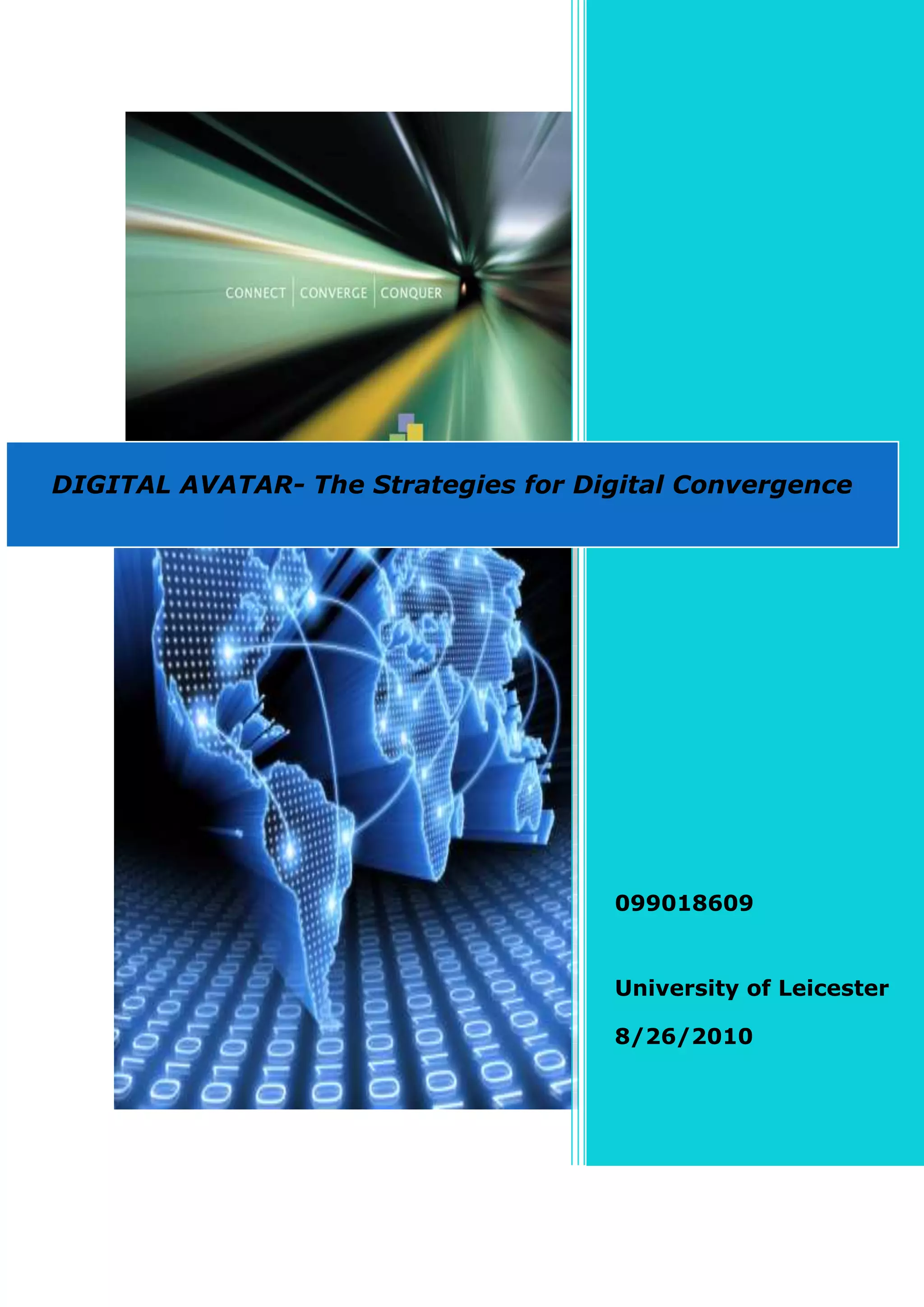 This document provides an introduction to a dissertation titled "Digital Avatar - The Strategies for Digital Convergence". It discusses how technological advancements and investments have led to the convergence of the media, telecommunications, internet, and technology industries. This convergence has transformed the communications landscape and created new distribution mechanisms for content. The dissertation will analyze strategies like strategic alliances, bundling, and integration that companies are using to capitalize on these new distribution opportunities across multiple platforms. It seeks to understand how these strategies can help drive the transformation to a more digitally converged system of communication.