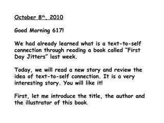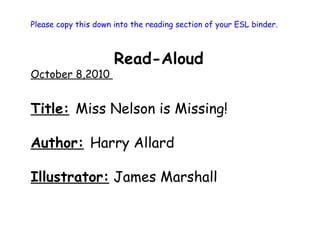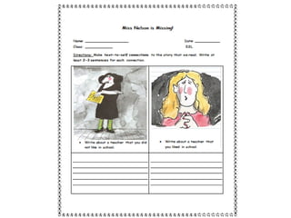 The document provides context for a reading lesson on the book "Miss Nelson is Missing!" by introducing the title, author, and illustrator. It asks students to make text-to-self connections to the story by describing personal experiences they can relate to the book, such as memories of favorite or disliked teachers from their own education. The teacher then shares two examples of her own text-to-self connections to help model the activity for students.