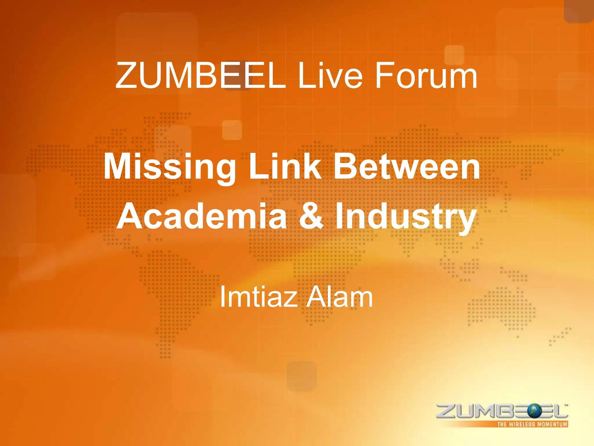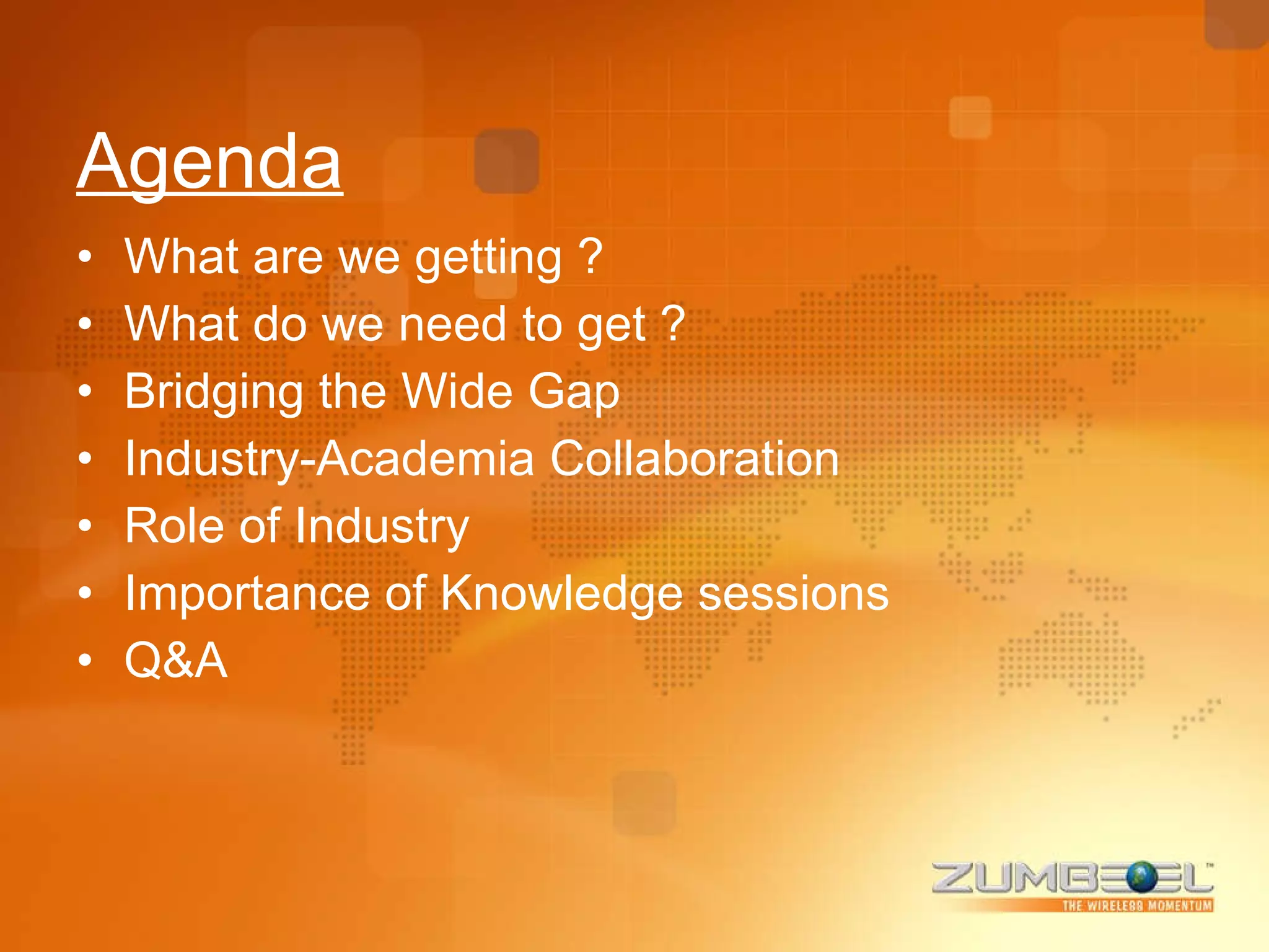 The document discusses bridging the gap between academia and industry. It suggests that ZUMBEEL can play a role in connecting students to industry through knowledge sharing sessions and collaboration. The agenda proposes increasing industry visits, workshops led by professionals, and involving students in developing tools to benefit industry. This would help students gain real-world experience and awareness of industry needs while helping educators and industry strengthen their relationship.