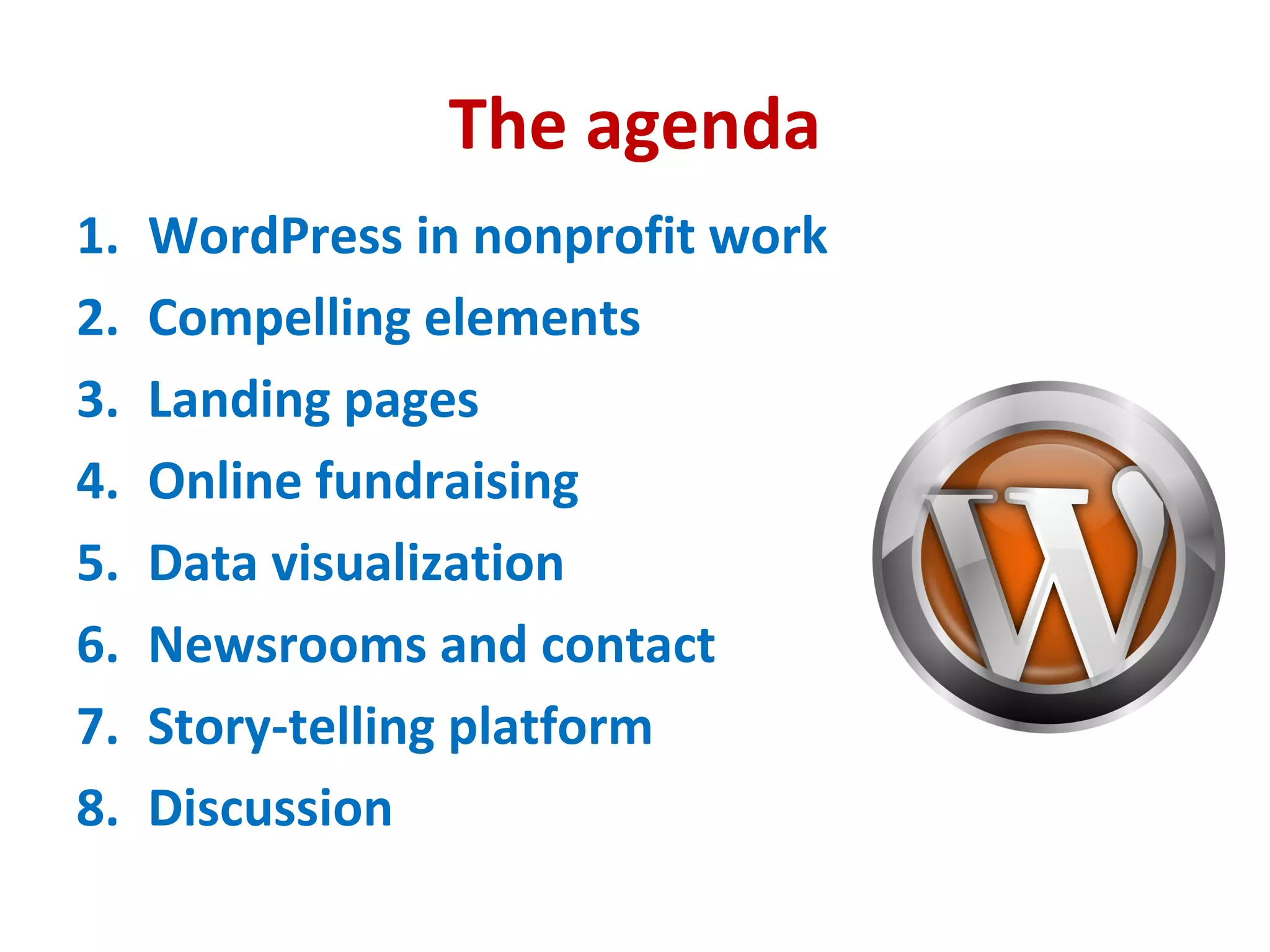 This document outlines how to build an effective nonprofit website using WordPress. It discusses using WordPress for storytelling, online fundraising, data visualization, newsrooms, contact pages, and landing pages. For each topic, it provides best practices, WordPress resources, and examples. The overall message is that WordPress is a powerful yet affordable open source platform for nonprofits to manage websites, engage supporters, and achieve their missions through compelling digital storytelling and calls to action.