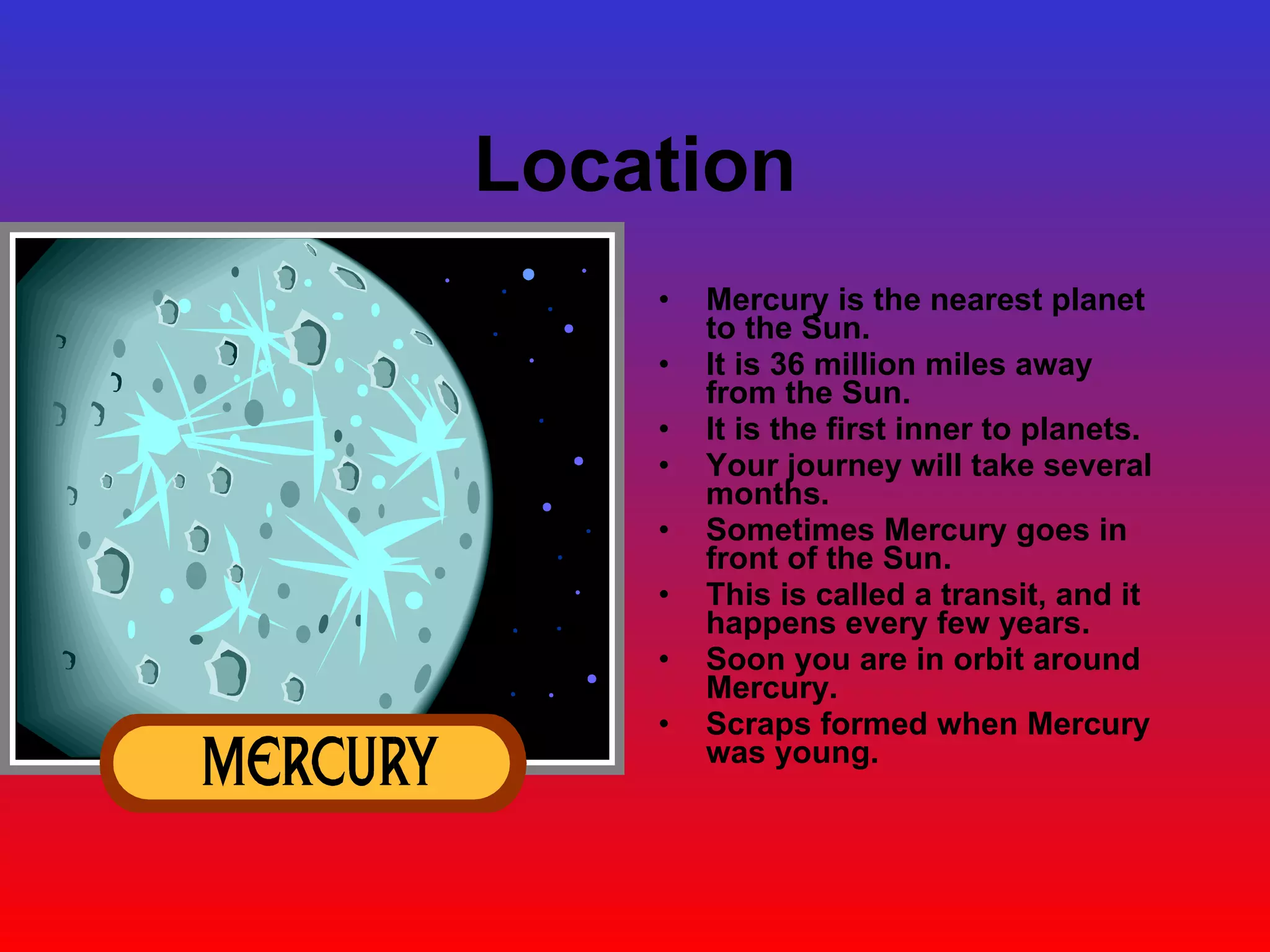 Mercury is the planet closest to the Sun, orbiting it every 88 Earth days. It has no natural satellites and its day lasts over 175 Earth days. Previous missions to Mercury include Mariner 10 in 1974, which was the first probe to visit the planet due to its proximity to the Sun and fast rotation making exploration difficult. Future robot explorers will be able to collect samples and take pictures to learn more about Mercury's terrain and conditions.