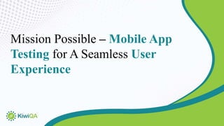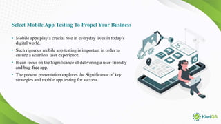 The document discusses the importance of mobile app testing in delivering user-friendly and reliable applications, highlighting its role in performance, functionality, usability, compatibility, and security. It outlines various testing phases, including performance, functional, compatibility, usability, and security testing, each targeting specific aspects of the app to ensure quality and security. Ultimately, effective mobile app testing is crucial for achieving a seamless user experience and providing a competitive advantage in the market.