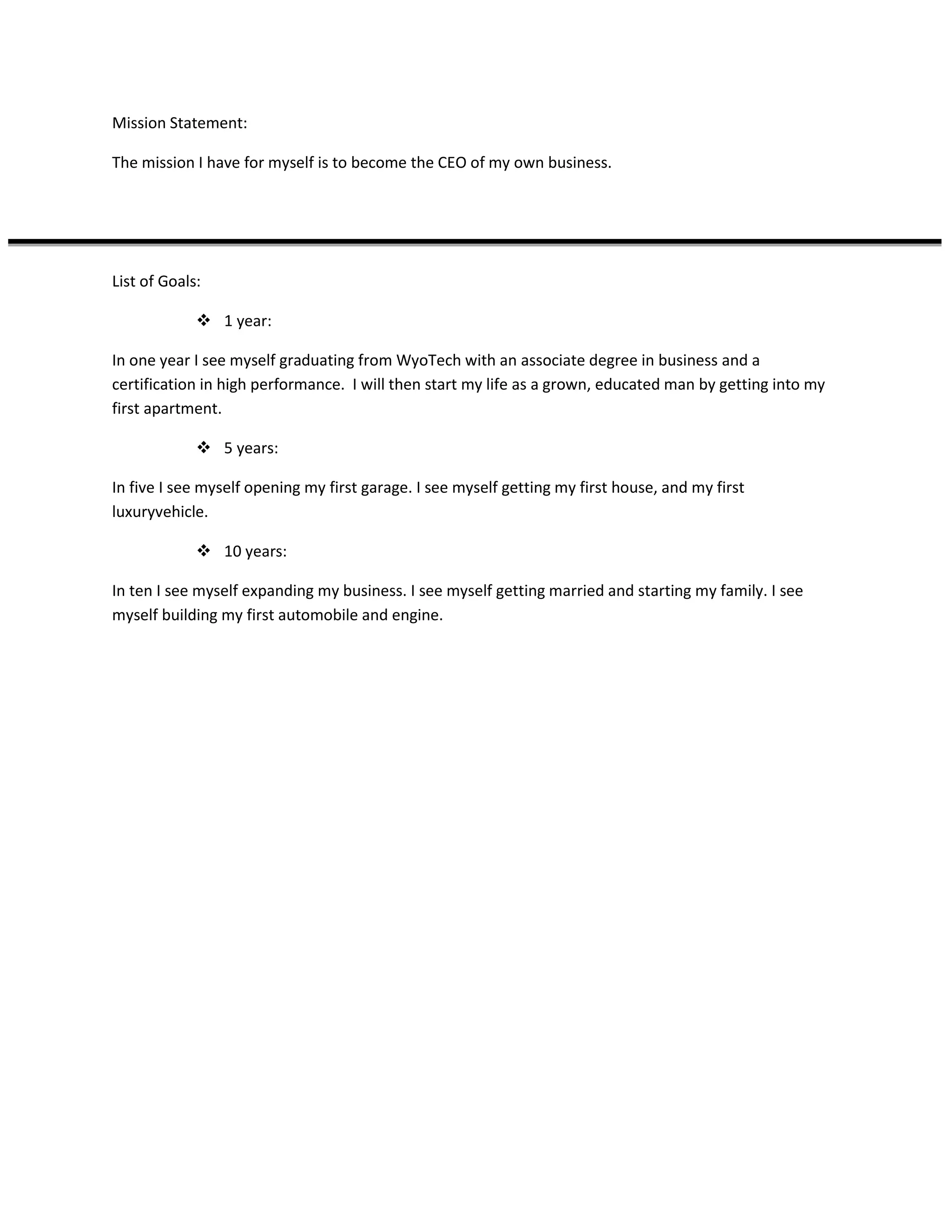 The document outlines an individual's mission and goals over the next 10 years. Their mission is to become the CEO of their own business. In 1 year, they aim to graduate with an associate degree in business and get their first apartment. In 5 years, they want to open their first garage, buy a house and luxury vehicle. In 10 years, they hope to expand their business, get married, start a family, and build their first automobile engine.