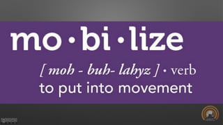This document discusses principles and perspectives on missions mobilization. It emphasizes that mobilization is the process of educating God's people about His plans for world evangelization and keeping them involved. Mobilizers inspire and connect individuals to strategic opportunities that align with God's global purpose. Effective mobilization requires dealing with deep roots like beliefs and worldviews, not just surface issues. Storytelling and meeting real needs are important for contextualization. The document presents principles for community development and mobilization, including starting small and letting ownership emerge locally.