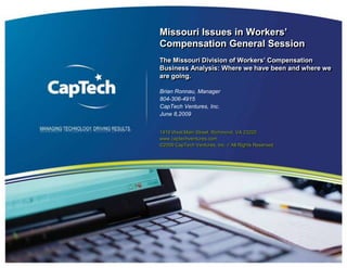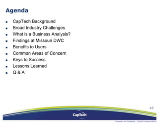 The document summarizes a presentation given by Brian Ronnau of CapTech Ventures on a business analysis conducted of the Missouri Division of Workers' Compensation (DWC). The analysis found siloed organizations, redundant processes, and a paper-focused system within the DWC. The presentation recommends transitioning the DWC to a more digital, automated, and data-driven system to benefit users by streamlining workflows, improving reporting, and increasing accessibility. Common concerns from stakeholders in modernizing the system include timelines for updating systems and the impact of changes. The keys to success include strong leadership, change management, and stakeholder involvement throughout the process.