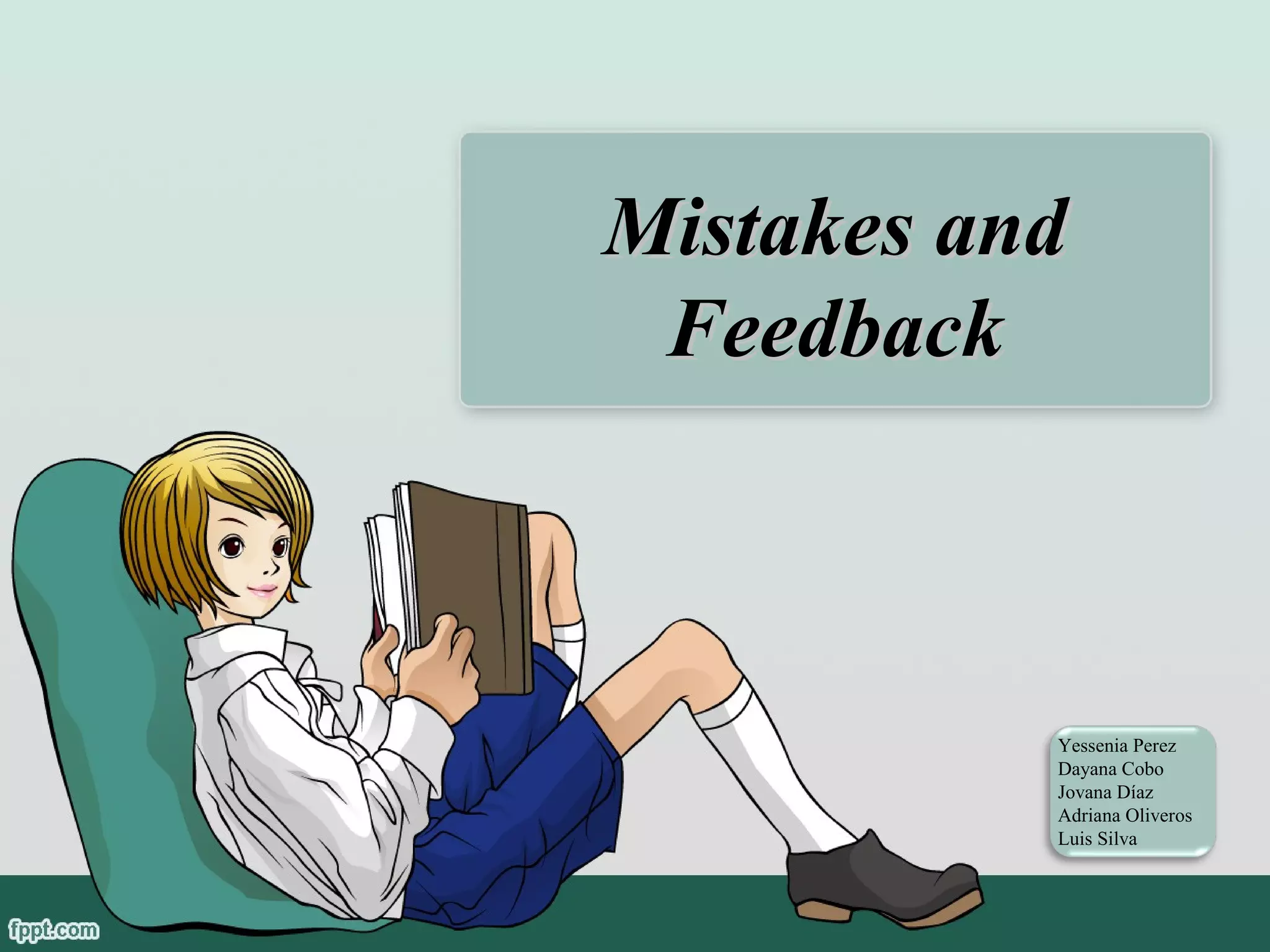Students make various types of mistakes in their language learning including slips, errors, and attempts. When assessing student performance, teachers provide both explicit and implicit feedback through praise, comments, grades, and reports. During oral work, it is best to correct mistakes as late as possible and feedback should be personalized. When providing written feedback, teachers should ensure it is legible, focuses on important aspects, uses a positive tone, and gives a manageable amount of constructive criticism and praise. Feedback should also be timely, use helpful styles and correction symbols, and consider the student perspective.