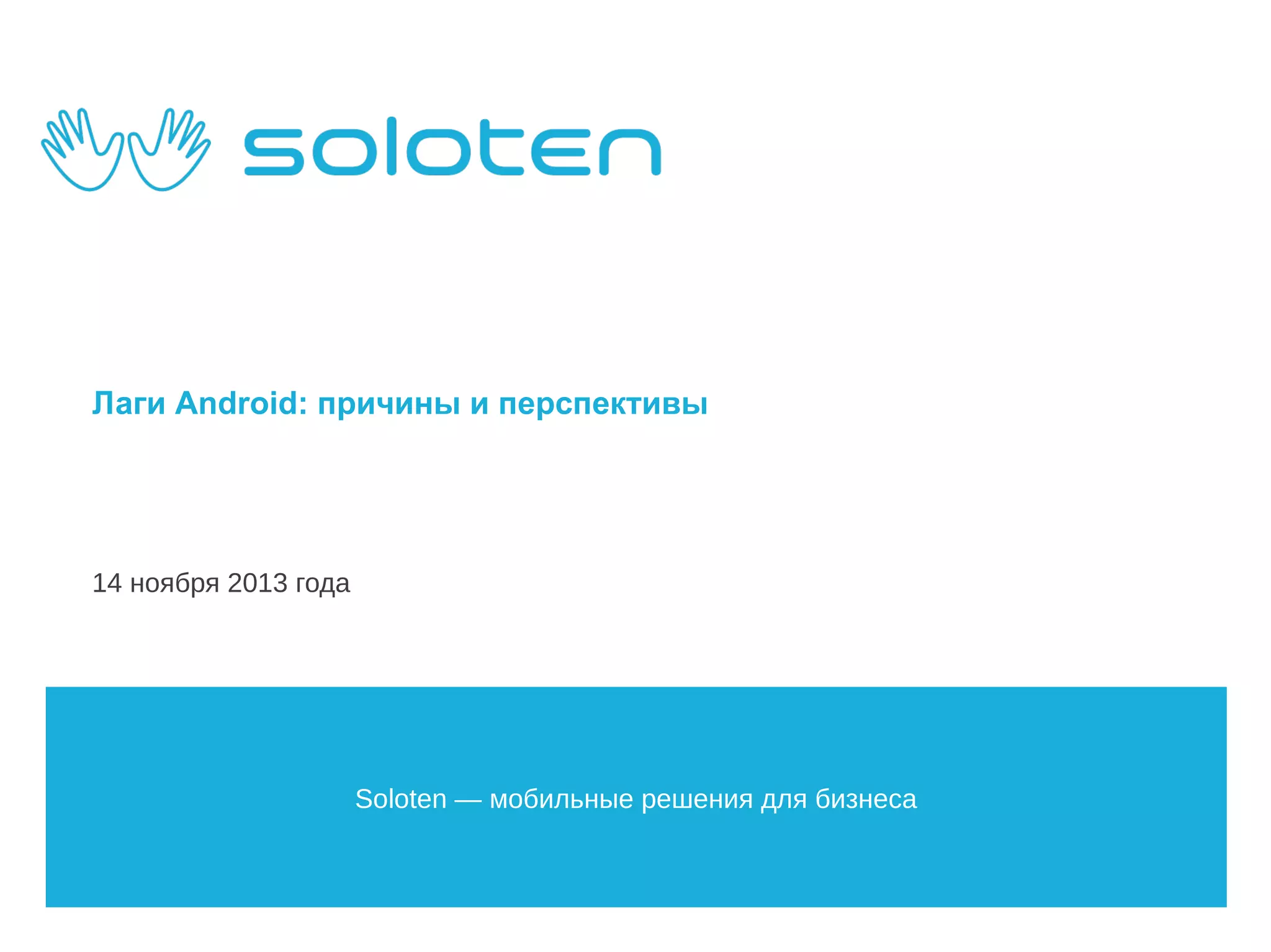 Документ анализирует причины лагов интерфейса Android по сравнению с iOS, выделяя мультиплатформенность и работу с потоками как основные факторы. Он упоминает виртуальную машину Dalvik и предлагает переход на Android Runtime (ART) для улучшения производительности. Также обсуждаются преимущества и недостатки перехода на новую архитектуру для повышения скорости работы приложений.