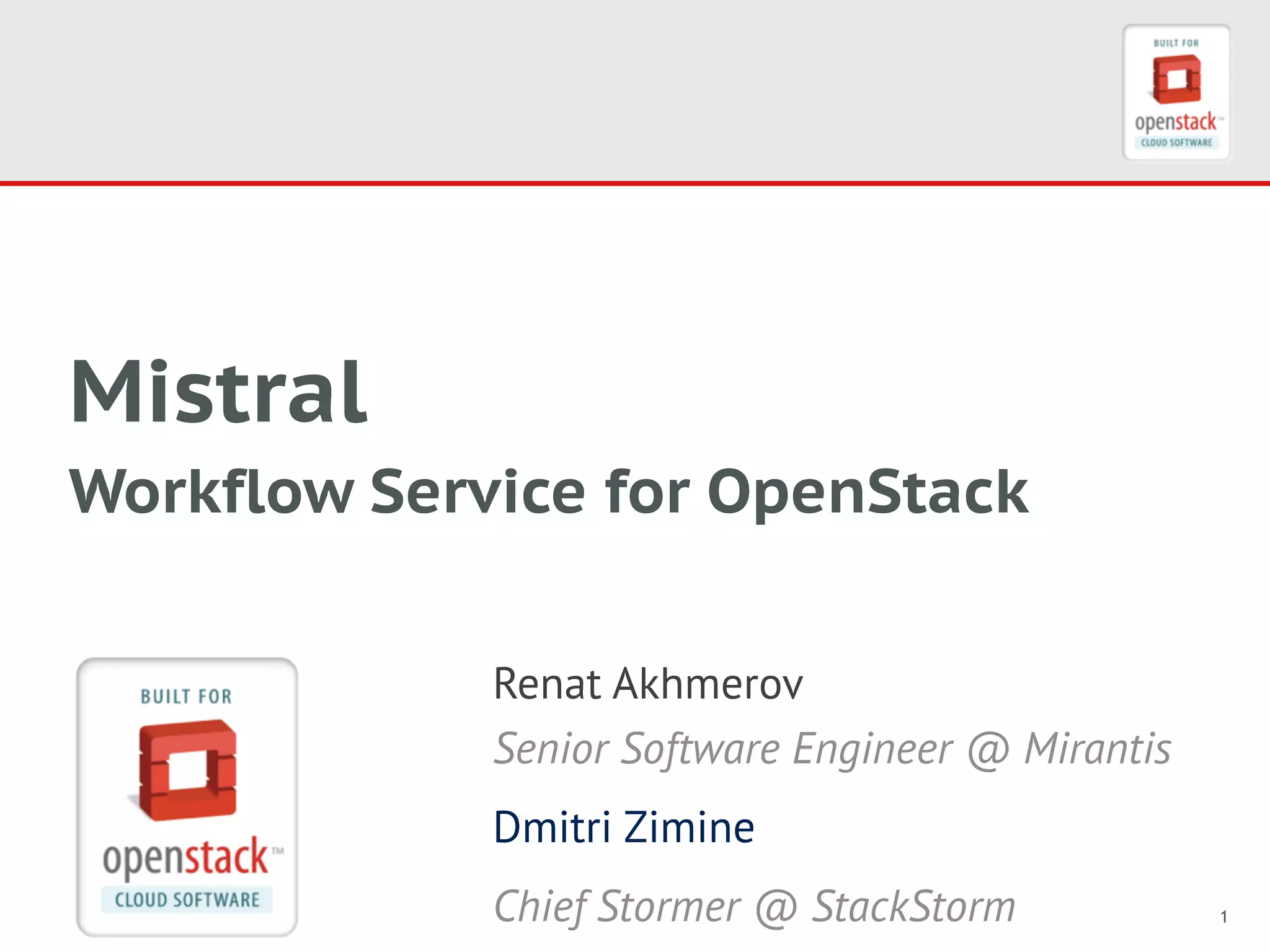 This document provides an overview of Mistral, an OpenStack workflow service. It describes Mistral's architecture and capabilities for defining, executing, and monitoring workflows. Workflows in Mistral are graphs of tasks with control and data flow. The current version supports basic task types like SSH and REST calls. Future plans include improving the workflow definition syntax, adding standard OpenStack actions, and developing the Horizon dashboard interface.