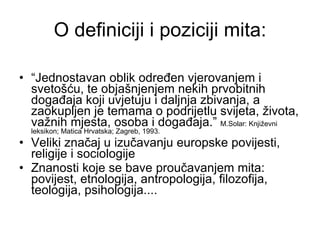 Mit se definira kao oblik vjerovanja koji objašnjava primarne događaje i tematizira podrijetlo svijeta i važnih događaja. Himera, kao primjer mita, simbolizira prijelaz iz matrijarhalnog u patrijarhalno društvo, a njeno ubijanje od strane junaka Belerofonta predstavlja promjenu u sustavima mjerenja vremena i društvenih struktura. Analiza mitova otkriva etimološke i strukturne elemente koji oblikuju pripovijesti i njihove odnose sa povijesnim kontekstom.