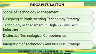 The document discusses the technological innovation process module which covers understanding different innovation models, technological forecasting concepts and applications, and product and process innovation. It describes the eight stages of technological innovation as basic research, applied research, development, engineering, manufacture, marketing, promotion, and continuous improvement. The module also covers static and dynamic innovation models proposed by Rothwell, technological forecasting tools like cross-impact analysis and morphological analysis, and different types of innovation strategies and their characteristics.