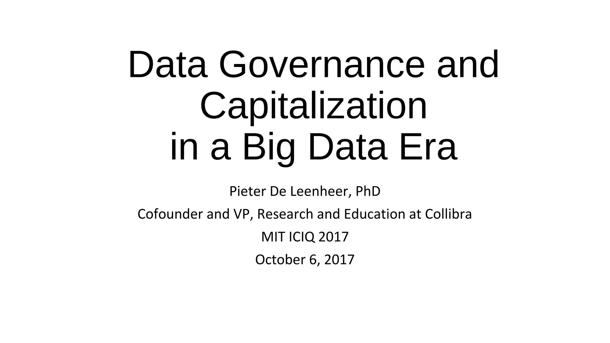 The document discusses the evolution of data governance in the context of big data, emphasizing the increasing importance of the Chief Data Officer (CDO) role and the need for a hybrid governance approach that combines traditional top-down methods with networked, peer-driven strategies. It highlights the challenges in managing data complexity, the necessity of trustworthy data, and the role of technology in facilitating data-driven decision-making. Additionally, it addresses the implications of digitalization of trust and the changing landscape for businesses as they adapt to an era of rapid data growth and transformation.