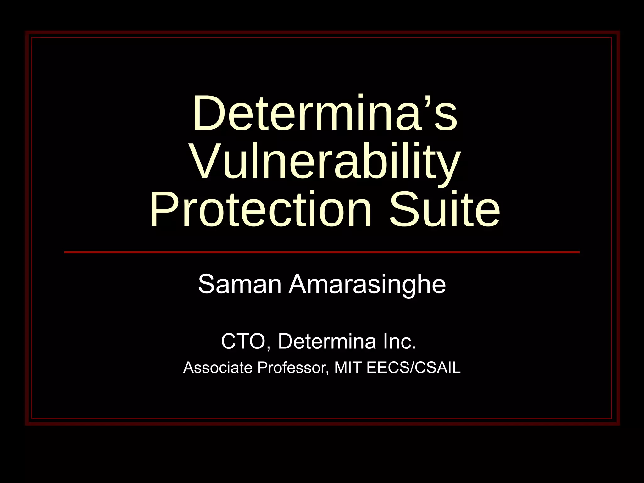 The document summarizes Determina's Vulnerability Protection Suite, which uses patented technology to stop both known and unknown (zero-day) attacks without needing updates, signatures, or behavior modeling. It focuses on vulnerability prevention rather than attack detection. The core technologies include the Managed Program Execution Engine, Memory Firewall, and LiveShield, which provide zero-day endpoint protection.
