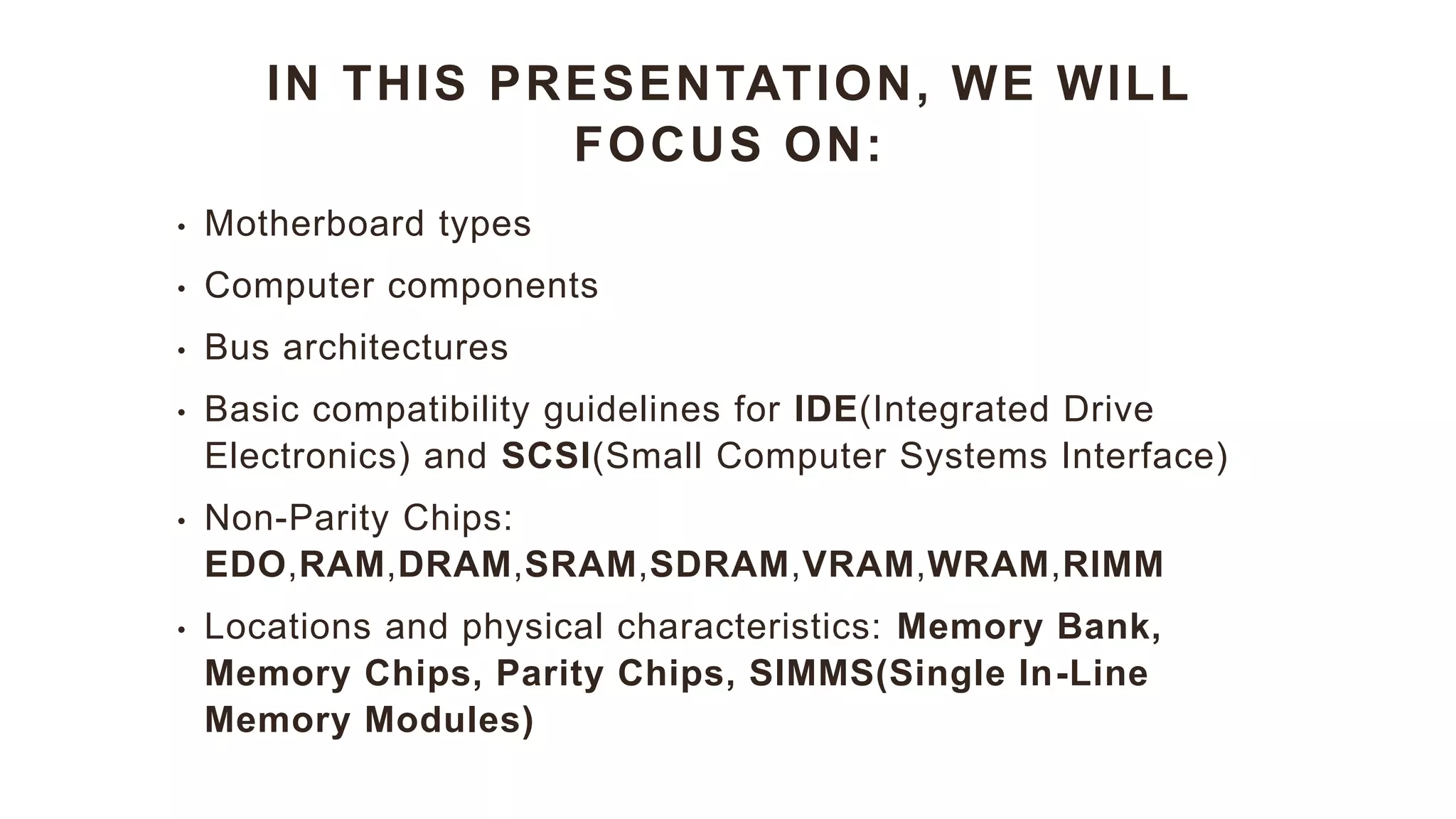 This document provides an overview of computer organization topics including motherboard types (Full AT, Baby AT, ATX), computer components (communication ports, SIMMs/DIMMs, processor sockets, cache memory), bus architectures (ISA, PCI, AGP, USB, VL-Bus), and memory module types (EDO, RAM, DRAM, SRAM, SDRAM, VRAM, WRAM, RIMM). It compares features of motherboard types, serial/parallel ports, SIMMs/DIMMs, processor socket types (LGA, PGA, BGA, ZIF), and describes the roles of components like cache memory and bus structures.