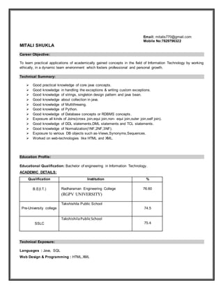 Mitali Shukla is seeking an opportunity in Information Technology that allows her to apply concepts learned academically in a dynamic team environment. She has a Bachelor's degree in IT and good knowledge of Java, SQL, HTML, XML and databases. Her past project involved creating an e-commerce website using PHP and MySQL. She is a good communicator and learner who takes initiative and responsibility.