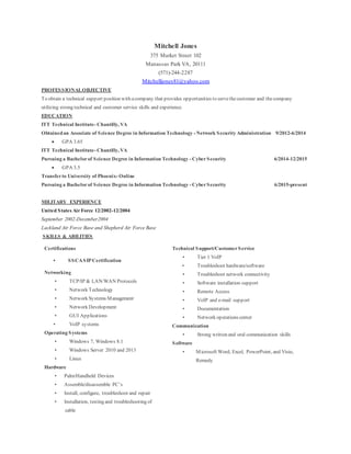 Mitchell Jones is seeking a technical support position, leveraging his strong technical and customer service skills. He holds an Associate's degree in Information Technology and is pursuing a Bachelor's degree in Cybersecurity, with relevant experience in various technical support roles, including as a Tier 1 VoIP NOC Technician. His work history showcases a range of customer service and technical abilities, complemented by military experience in the U.S. Air Force.