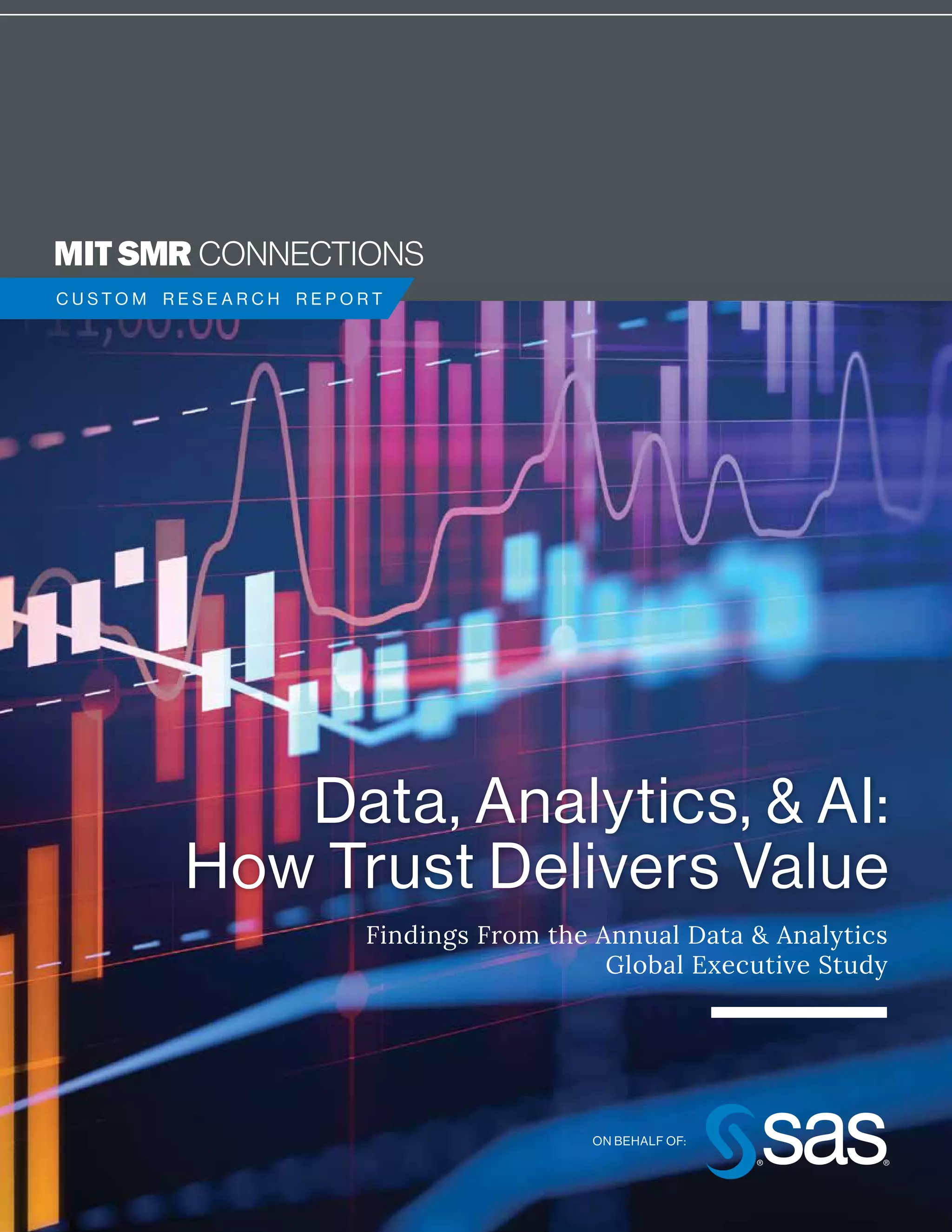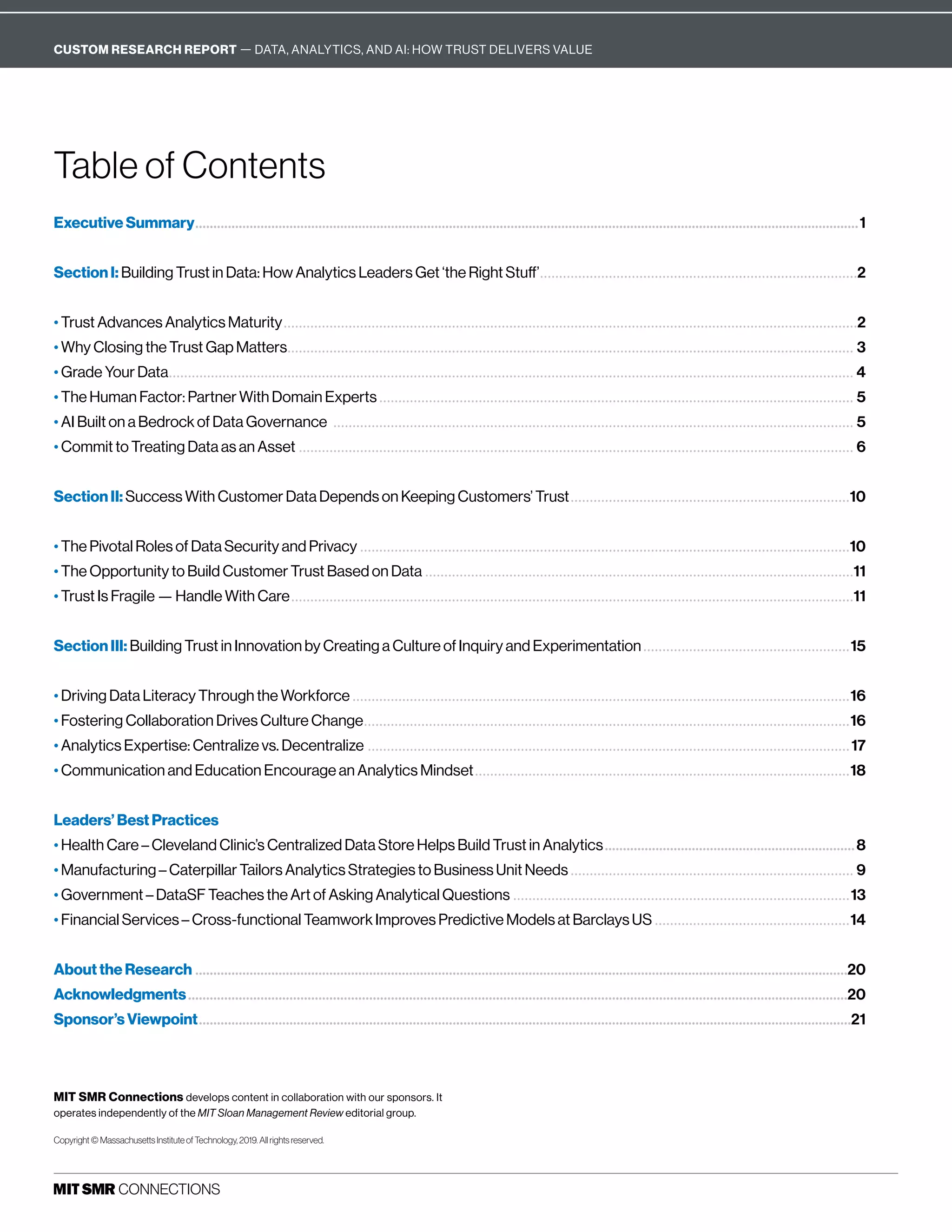 The document is a custom research report focused on the importance of trust in data, analytics, and AI for delivering value. It explores strategies for building trust in data governance, the significance of customer trust in data privacy, and fostering a culture of innovation through analytics. Key findings emphasize the necessity for better data governance, the opportunities presented by data privacy, and the role of an analytics-driven culture in enhancing innovation.