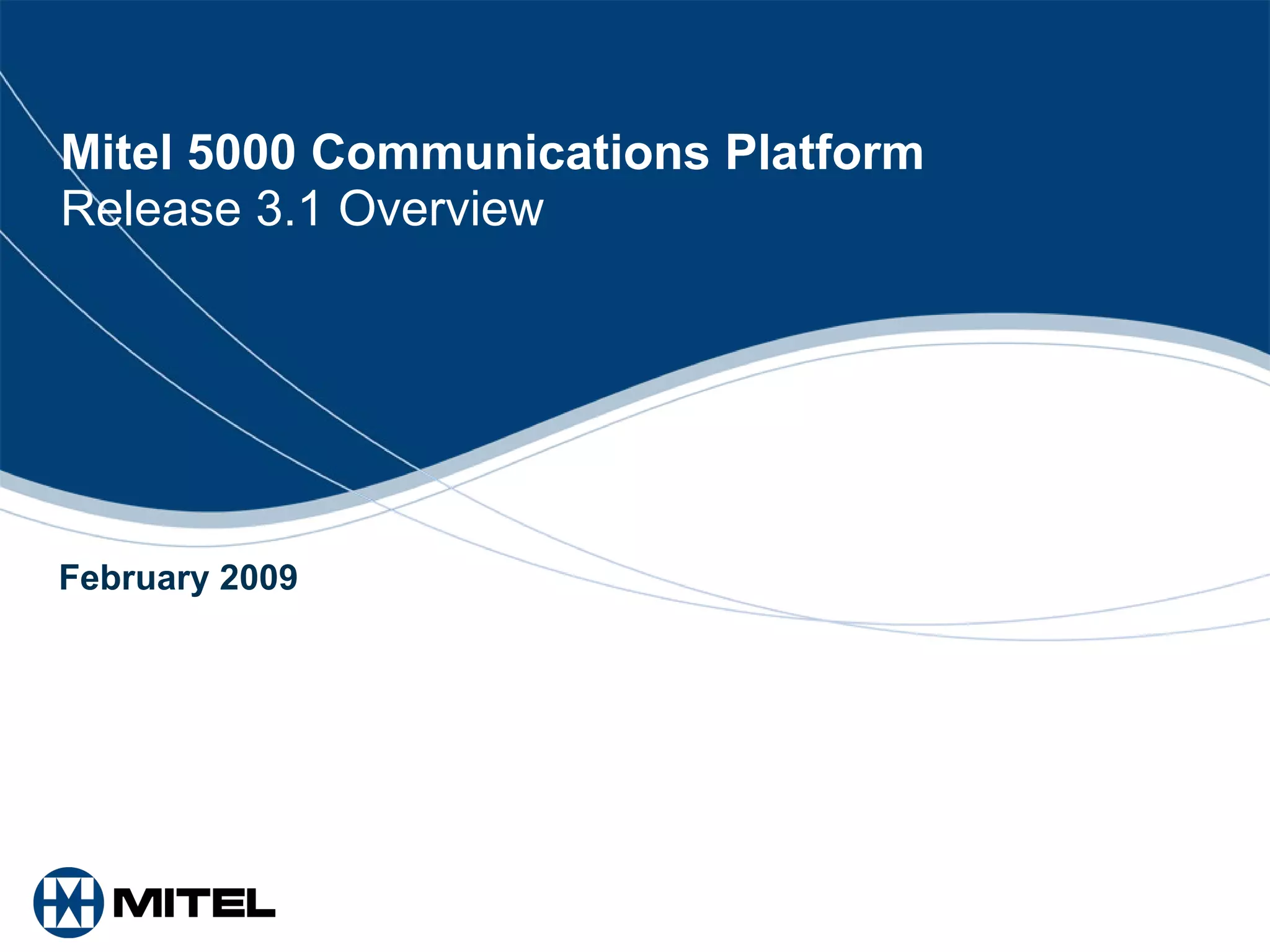 The document provides an overview of the Mitel 5000 Communications Platform Release 3.1. It discusses key features of the platform such as supporting digital, IP, or hybrid phone systems. It also outlines enhancements in Release 3.1 including expanded integration with Mitel applications and additional peripheral support to provide flexibility and connectivity for small to medium-sized businesses.