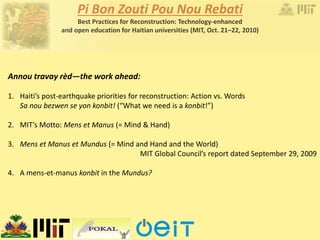 The document outlines a conference held at MIT focused on reconstruction best practices for Haitian universities through technology-enhanced and open education. It emphasizes the need for collaborative efforts ('konbit') in addressing Haiti's educational needs post-earthquake, highlighting the role of MIT as a leader in global research and education. The approach promotes the importance of open educational resources and community participation in fostering academic development in Haiti.