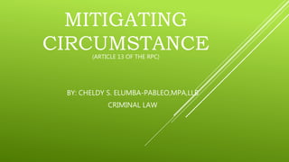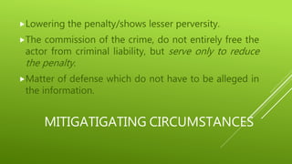 This document discusses mitigating circumstances under Article 13 of the Revised Penal Code of the Philippines. It defines mitigating circumstances as factors that lessen criminal liability and reduce the penalty for a crime. There are ordinary mitigating circumstances explicitly listed in the code as well as privileged mitigating circumstances like minority. The document examines several specific ordinary mitigating circumstances in detail, such as insufficient provocation, immediate vindication of a grave offense, and voluntary surrender. It also distinguishes ordinary from privileged mitigating circumstances in terms of how they affect penalties.