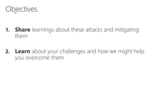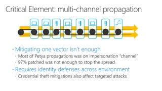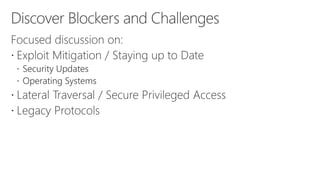 This document discusses recommendations to improve defenses against rapid cyberattacks. It begins with a review of how rapid attacks work, then provides specific recommendations in four areas: attack surface reduction, lateral traversal/securing privileged access, business continuity/disaster recovery, and exploit mitigation. Potential blockers to implementing the recommendations are also identified relating to technology, processes, and stakeholder buy-in. Next steps include assigning action items identified in the meeting.
