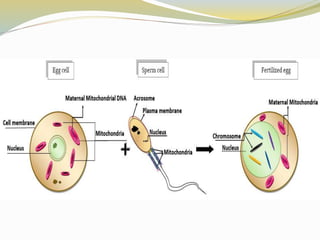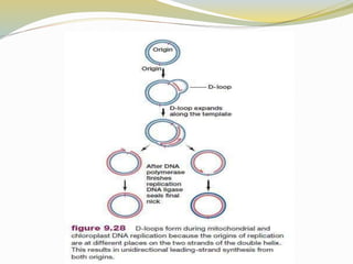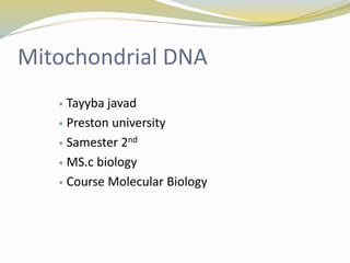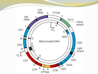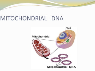 Mitochondrial DNA is the circular DNA found in mitochondria. It contains 37 genes and is 16,569 base pairs long. Unlike nuclear DNA, mitochondrial DNA is inherited solely from the mother. It replicates through a process called D-loop replication and lacks proofreading, resulting in a high mutation rate. Mitochondrial DNA encodes proteins that are essential components of the oxidative phosphorylation system, which generates energy for the cell.