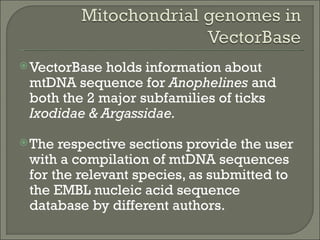 VectorBase contains mitochondrial DNA sequence information for Anopheline mosquitoes and two subfamilies of ticks. The sections provide compiled mtDNA sequences submitted to EMBL by various authors. Users can view lists of Anopheles gambiae mitochondrial genes and orthologs of genes from multiple species, including gene accession numbers linked to GenBank entries and sequence coordinates. Lists of Anopheles species and their mitochondrial genes are also available.