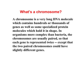 The document discusses chromosomes, karyotypes, mitosis, and the cell cycle. It explains that chromosomes contain genes and pair during cell division. A karyotype shows the total chromosome number. Mitosis is cell division that produces two identical cells through the phases of interphase, prophase, metaphase, anaphase, and telophase. The cell cycle includes growth, DNA replication, and cell division phases. Uncontrolled cell division can cause cancer.