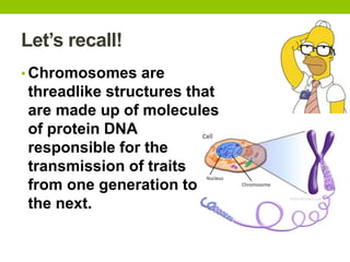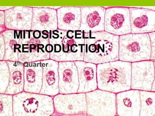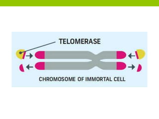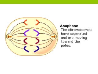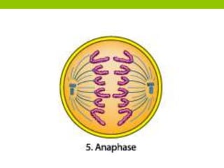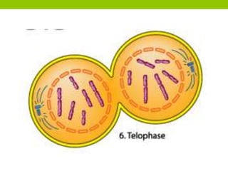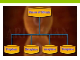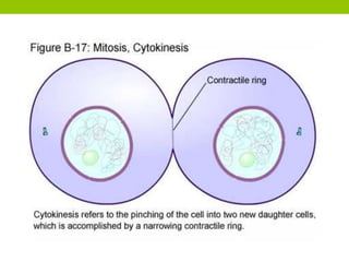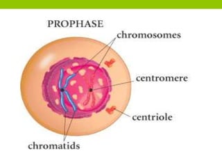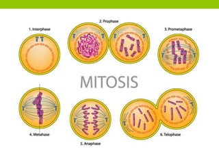 This document discusses mitosis and cell division. It begins by defining key terms like chromosomes, haploid and diploid cells. It then describes the main cell parts involved in cell division like centrioles, centromeres, cytoskeleton, ribosomes and nucleolus. The rest of the document explains the stages of mitosis (prophase, metaphase, anaphase, telophase, cytokinesis) and what occurs in each stage. It also discusses what happens when cell division goes wrong, like causing cancer, and the role of telomeres and telomerase in aging.
