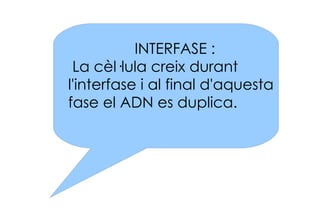 INTERFASE : Lacèl·lula creix durant l'interfase i al final d'aquesta fase el ADN es duplica.