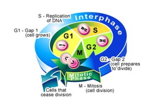 The cell cycle consists of interphase and mitosis. During interphase, the cell grows and duplicates its DNA. Mitosis is divided into prophase, metaphase, anaphase, and telophase where the duplicated chromosomes separate and two identical daughter cells form through cytokinesis. In plant cells, cytokinesis involves cell plate formation while in animal cells it involves cleavage furrow invagination.