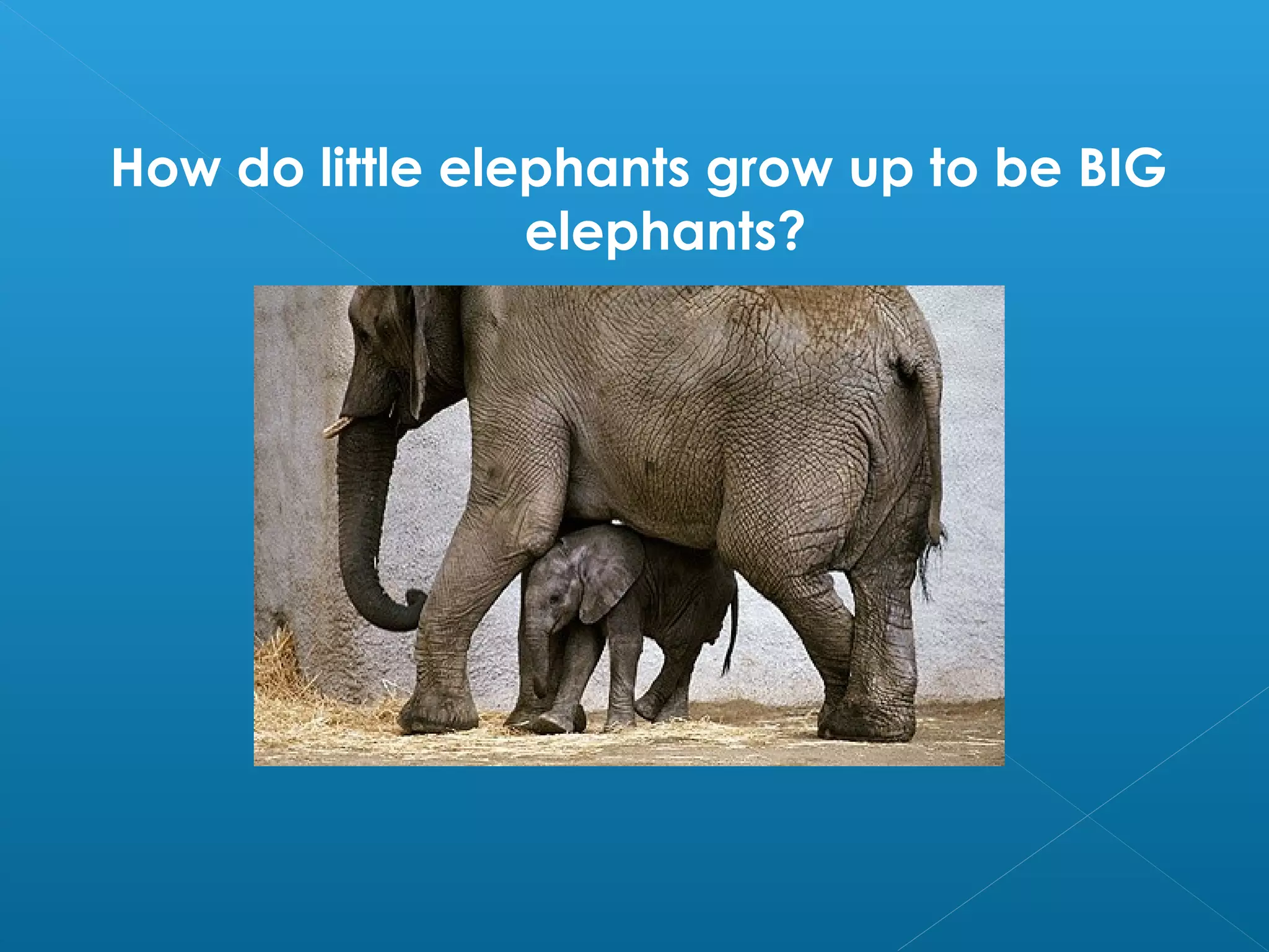 Little elephants grow up to be big elephants through cell growth and division. Cells multiply through mitosis, where the cell makes an identical copy of its DNA and divides into two daughter cells. This cell growth and division allows the elephant to increase in size as it matures, rather than cells individually increasing in volume. The document provides information about the cell cycle and process of mitosis.
