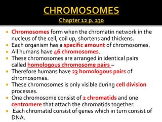 Chromosomes form through coiling and condensing of chromatin during cell division. Humans have 23 pairs of homologous chromosomes, for a total of 46. Each chromosome contains DNA and genes. The cell cycle involves interphase and mitosis, resulting in two identical daughter cells through cytokinesis. Mitosis consists of prophase, metaphase, anaphase, and telophase where the chromosomes align and separate. Cancer occurs when cell cycle controls are lost, allowing uncontrolled cell division and tumor formation.