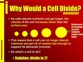 Cells undergo cell division through mitosis in order to distribute replicated DNA equally between two daughter cells. Mitosis consists of four stages - prophase, metaphase, anaphase and telophase - where the chromosomes condense, align at the center, separate, and reach opposite poles. Cytokinesis then partitions the cytoplasm between the two new cells. The number of times a cell can divide is limited and cell division decreases with age, leading eventually to cell death.