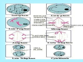 Mitosis is the process of cell division where a cell splits into two identical daughter cells. It has four main phases: prophase, metaphase, anaphase, and telophase. During interphase, the cell grows and prepares for division, including replicating its DNA. In mitosis, the nuclear membrane breaks down and chromosomes condense and align before splitting into two identical sets that are separated into two new daughter nuclei, which are then partitioned into two new daughter cells during cytokinesis.