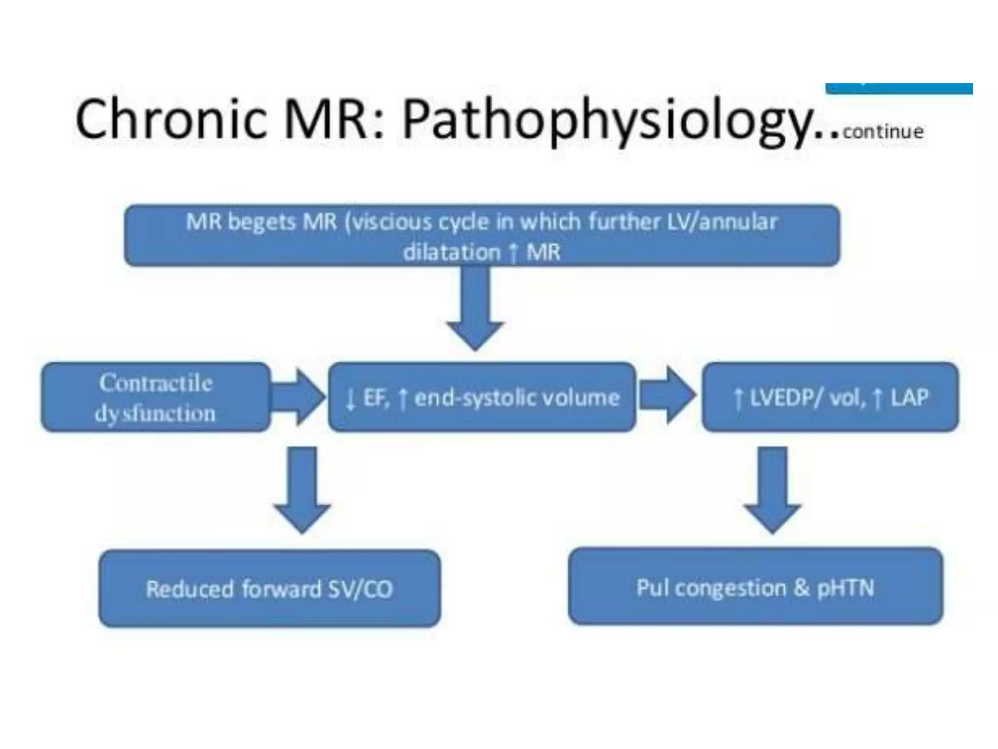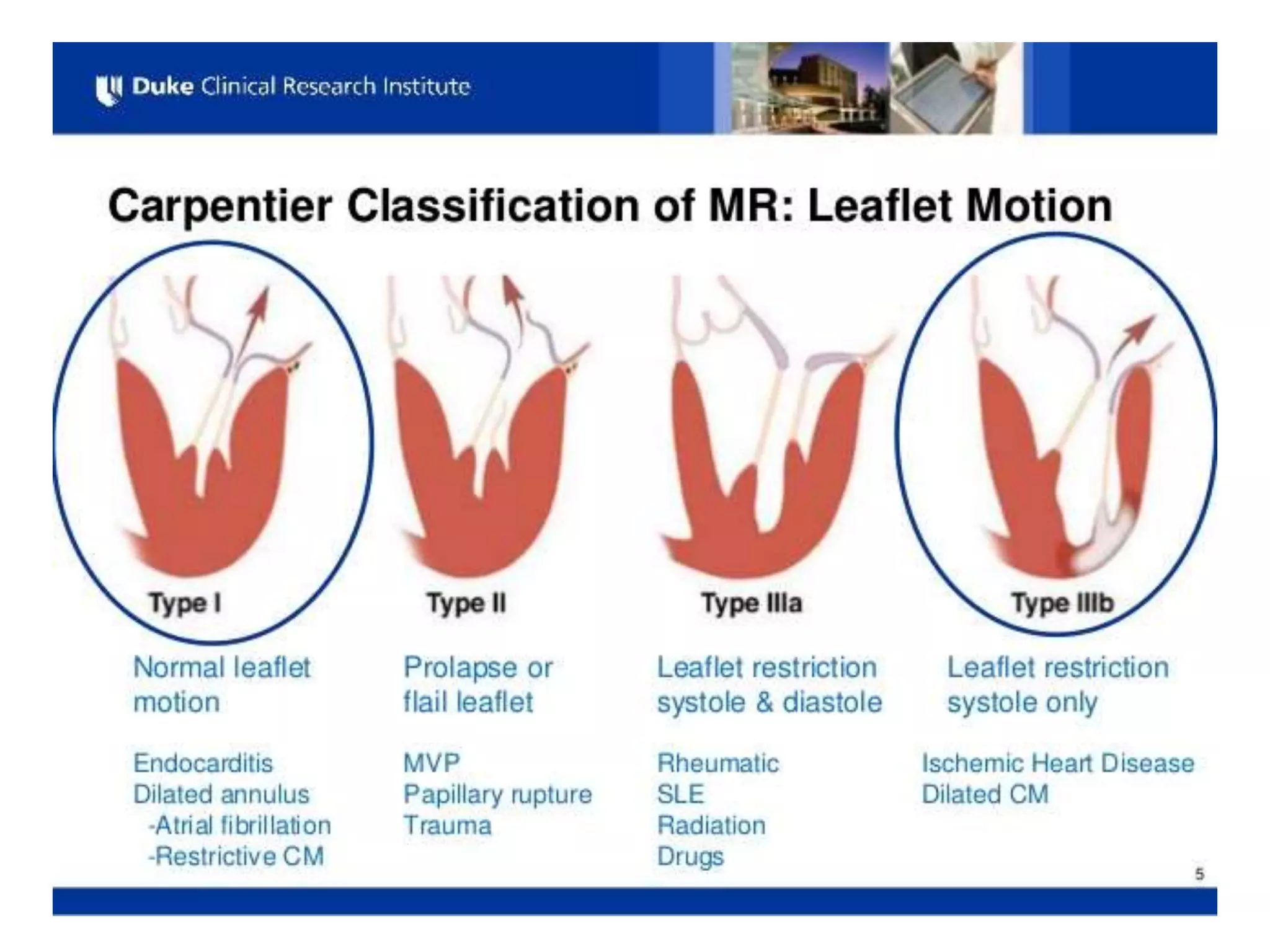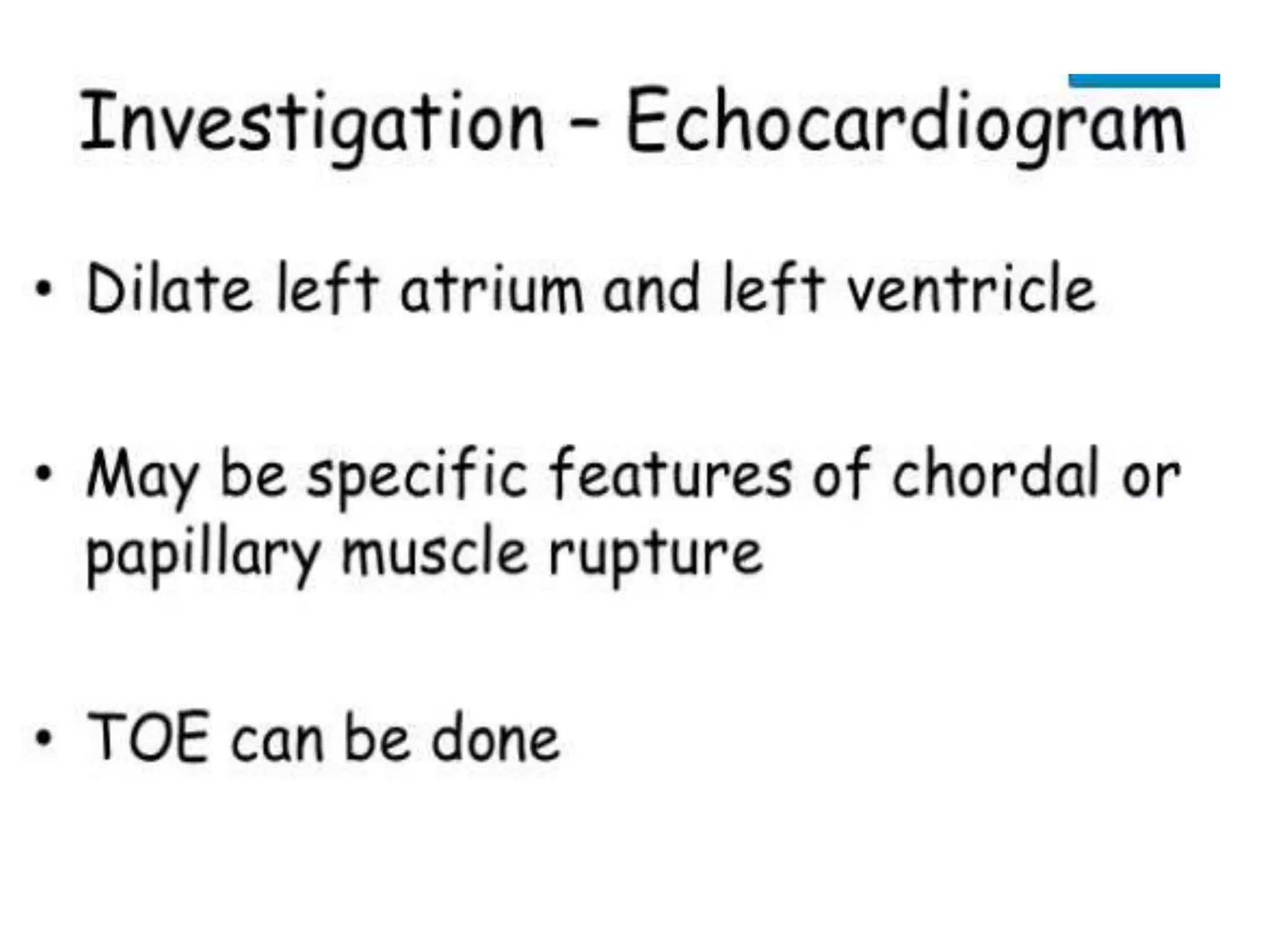 Mitral regurgitation is the abnormal reversal of blood from the left ventricle to the left atrium, caused by disruption of the mitral valve apparatus. It can be divided into acute, chronic compensated, and chronic decompensated stages. The etiology includes primary causes where the valve itself is abnormal, and secondary causes where the heart problem leads to valve dysfunction. Diagnosis is typically made using a 2D echocardiogram to visualize the valve and assess the severity and cause of regurgitation. Treatment options involve medical management or surgical repair or replacement of the valve.
