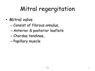 The document discusses mitral regurgitation, detailing its causes such as degenerative disease, ischemic heart disease, and infectious endocarditis. It explains the pathophysiology, symptoms, signs, and investigation methods including echocardiograms and electrocardiograms. Treatment options are mentioned, focusing on prophylaxis against endocarditis and options for surgical intervention if progressive cardiac enlargement is detected.