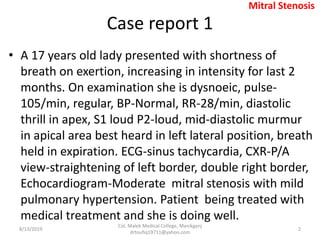 The document contains 12 case reports of patients presenting with mitral stenosis. The cases describe the patients' histories, examination findings, test results and treatment. Mitral stenosis is characterized by a narrowing of the mitral valve opening between the left atrium and ventricle. Common causes include rheumatic fever. Symptoms include shortness of breath and signs include murmurs, increased pulse and elevated jugular venous pressure. Treatment options include medical management, percutaneous mitral valve procedures or surgery.