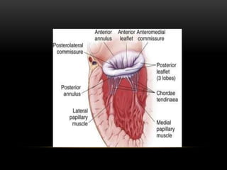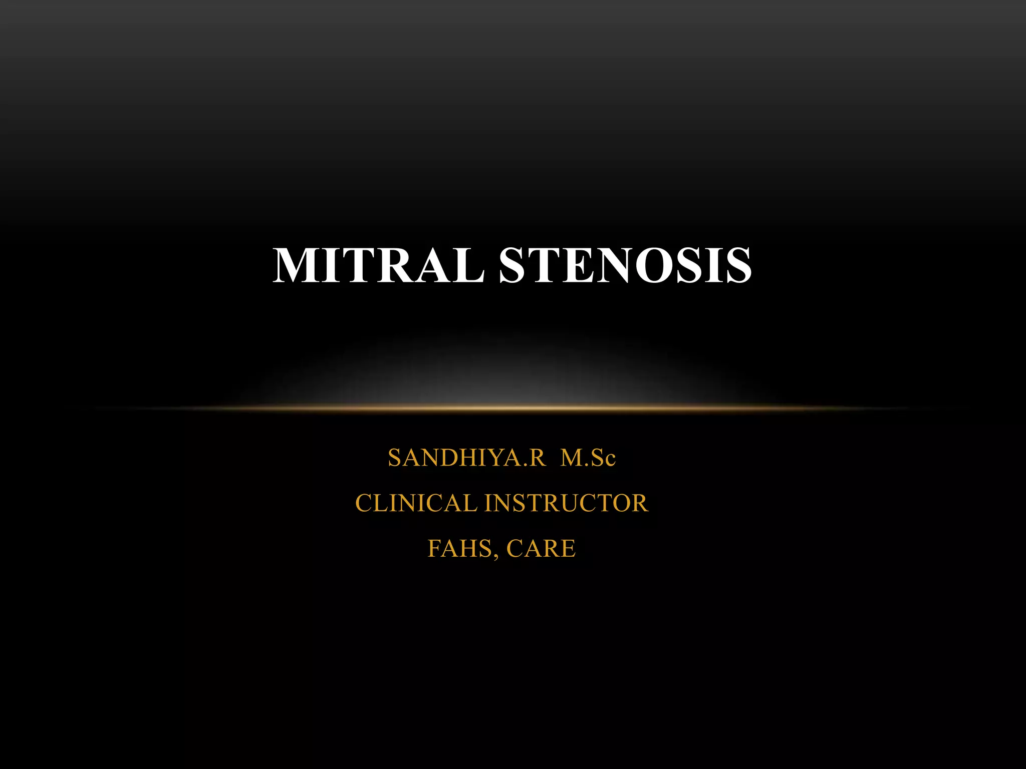Mitral stenosis is a condition characterized by the narrowing of the mitral valve, commonly caused by rheumatic heart disease, leading to significant hemodynamic changes and clinical symptoms such as dyspnea and palpitations. Diagnosis involves auscultation revealing characteristic murmurs, echocardiography for severity assessment, and other imaging techniques, while treatments include medical management and interventions like balloon valvuloplasty or surgical options based on valve condition and patient symptoms. Complications can arise from both the valve condition and treatment interventions, necessitating careful monitoring and management.