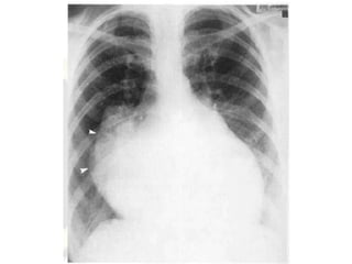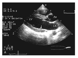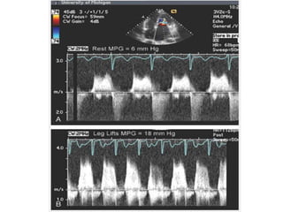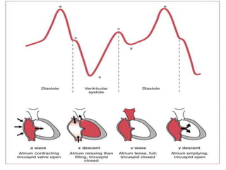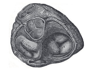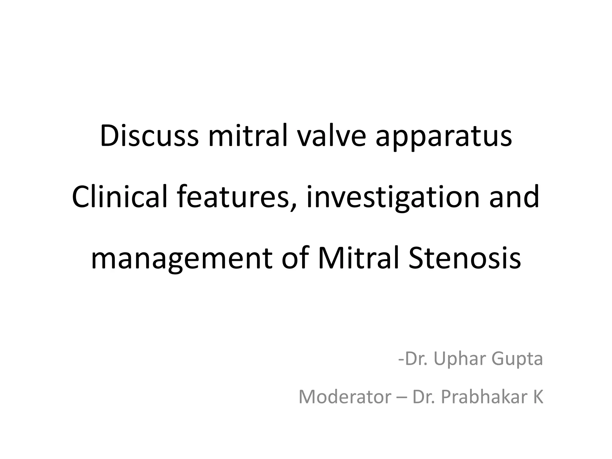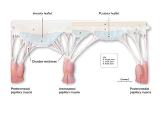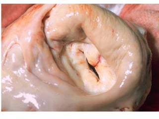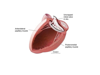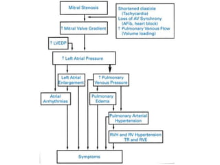 The mitral valve lies between the left atrium and left ventricle. Mitral stenosis is usually caused by rheumatic fever which causes scarring of the mitral valve leaflets and commissures. In early mitral stenosis, the leaflets can open but have restricted motion. Over time, the leaflets become thickened and rigid, reducing valve opening. This causes symptoms like dyspnea and pulmonary hypertension. On examination, findings may include an irregular pulse from atrial fibrillation, elevated jugular venous pressure, accentuated S1, and a diastolic murmur. Severe mitral stenosis can lead to right heart failure and complications like hemoptysis.