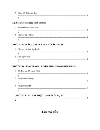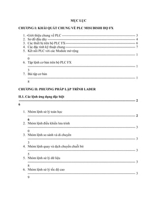 Tài liệu này trình bày tổng quan về PLC Mitsubishi dòng FX, bao gồm cấu trúc, chức năng, và phương pháp lập trình. Nó cũng cung cấp kiến thức về các thiết bị, ký hiệu, và lệnh cơ bản trong lập trình PLC, cùng với ứng dụng thực tế trong hệ thống điều khiển tự động. Mục đích của tài liệu là hỗ trợ người đọc trong việc nghiên cứu và thực hành với PLC Mitsubishi FX.