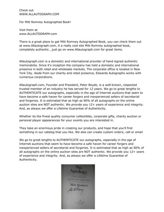Allautograph.com is a domestic and international provider of authenticated memorabilia including autographed books by Mitt Romney. The company has 12 years of experience authenticating items to combat the large number of forged items sold online. Allautograph.com guarantees the authenticity of its items and offers custom orders in addition to products in its catalog.
