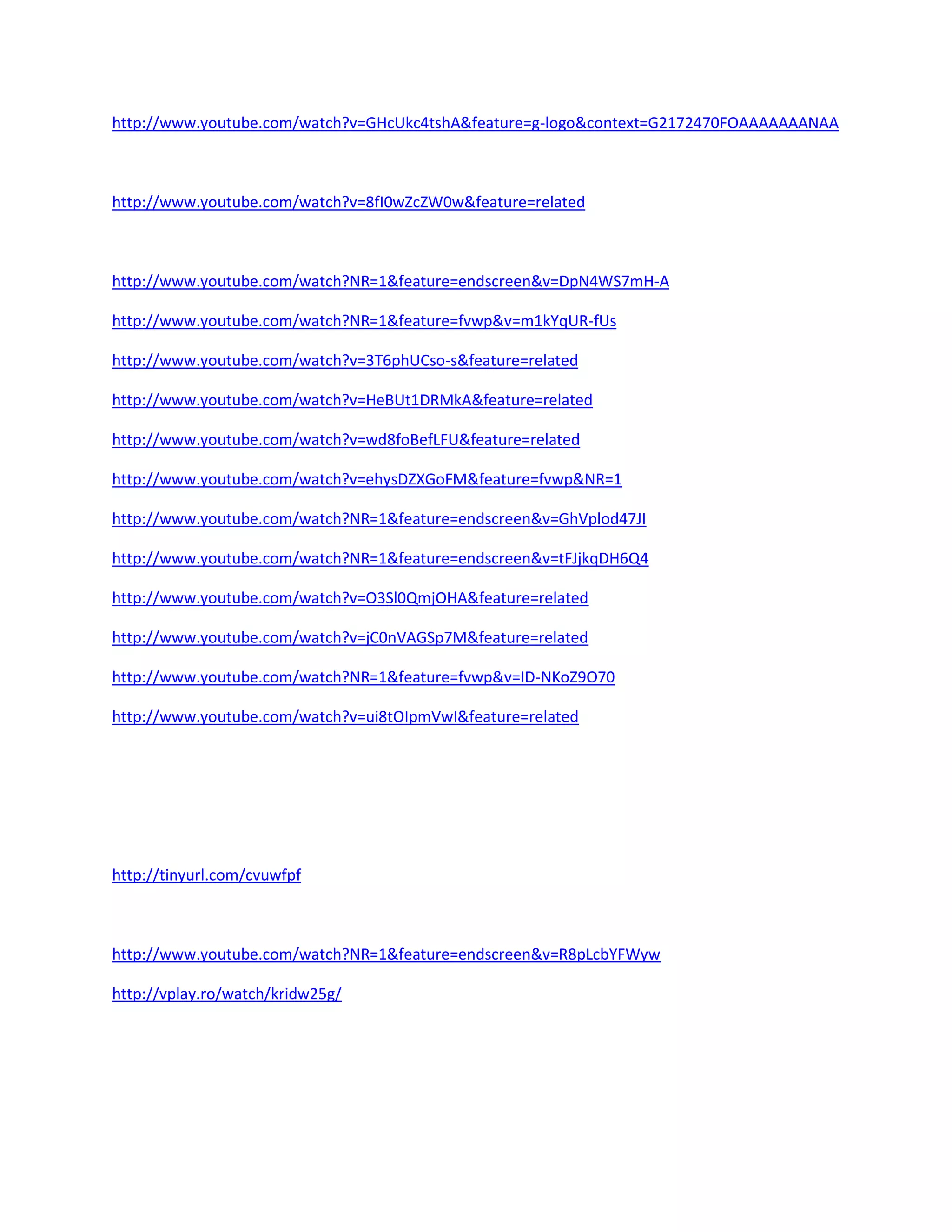 The document contains a collection of links to YouTube videos on various topics. It is difficult to summarize the content of the videos without watching them. In general, the links reference videos but their specific subjects, messages or themes cannot be determined from the links alone.