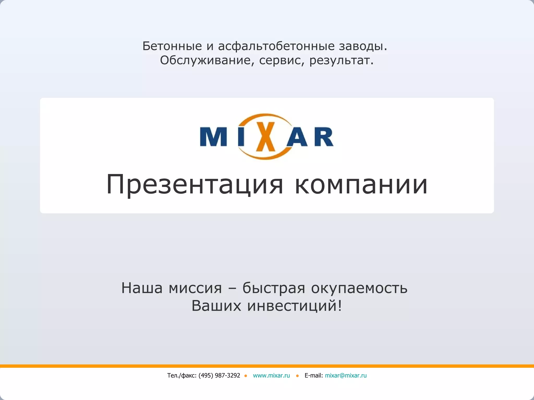 Презентация компании Mixar описывает услуги по продаже и обслуживанию бетонных и асфальтобетонных заводов с акцентом на быструю окупаемость инвестиций. Компания акцентирует внимание на высоком качестве оборудования, инновационных технологиях и клиентском обслуживании, а также на длительном партнерстве с клиентами. Стратегия включает тщательный отбор и сотрудничество с ведущими производителями для обеспечения конкурентоспособного соотношения цена/качество.